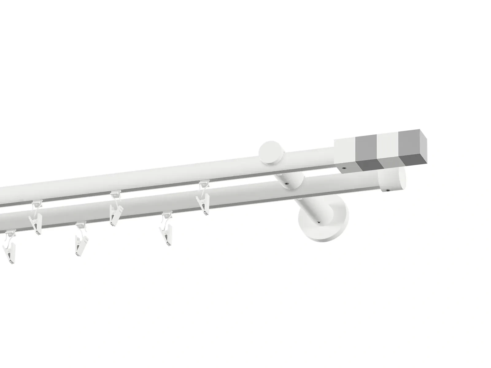 Dvojradová drážková garniža s povrchovou úpravou - biela lakovaná. Garniže sú dodávané sú v kompletoch. Tvar koncovky a typ držiaka podľa zadaného výberu.