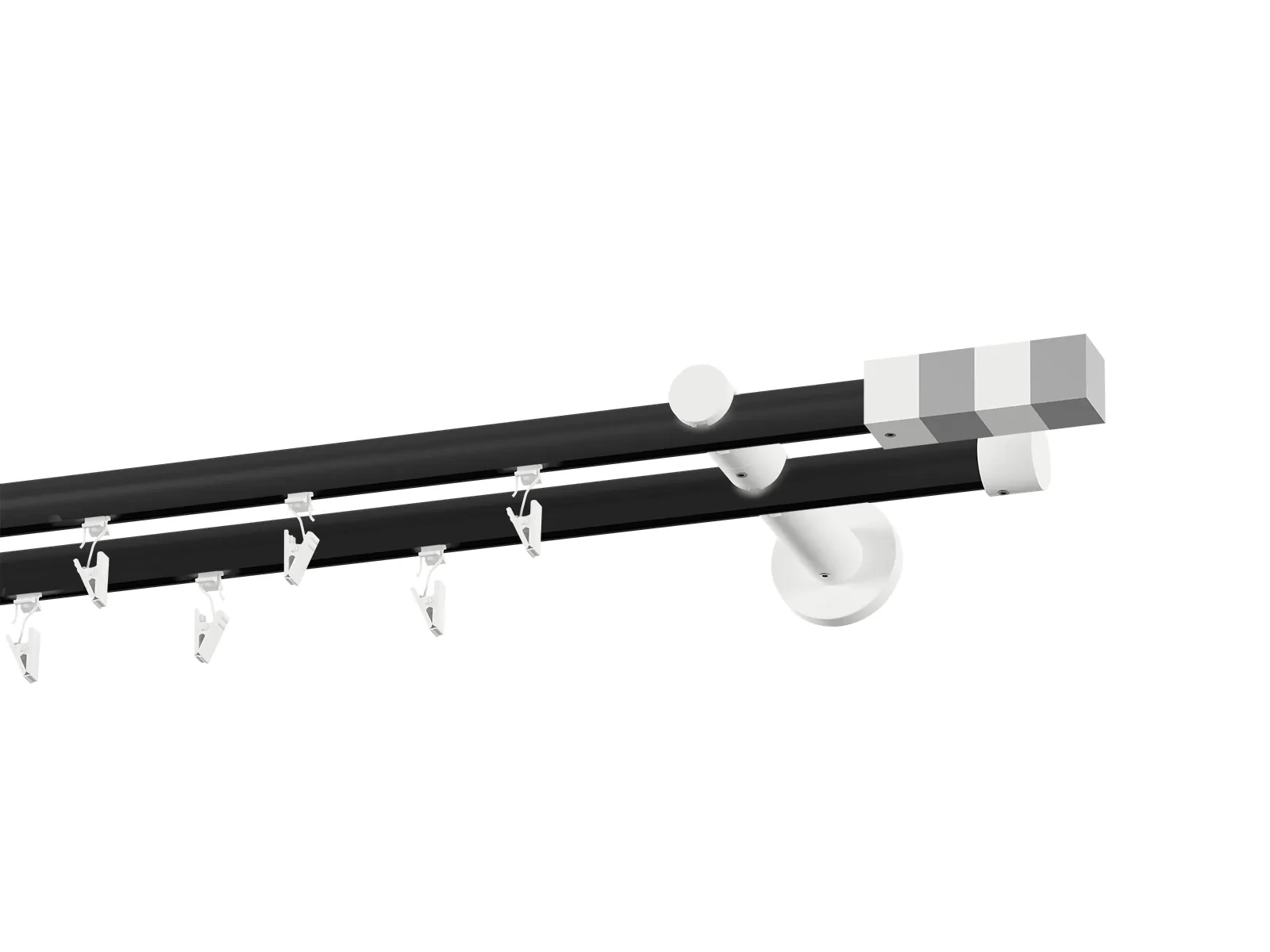 Dvojradová drážková garniža s povrchovou úpravou - čierno biela lakovaná. Garniže sú dodávané sú v kompletoch. Tvar koncovky a typ držiaka podľa zadaného výberu.