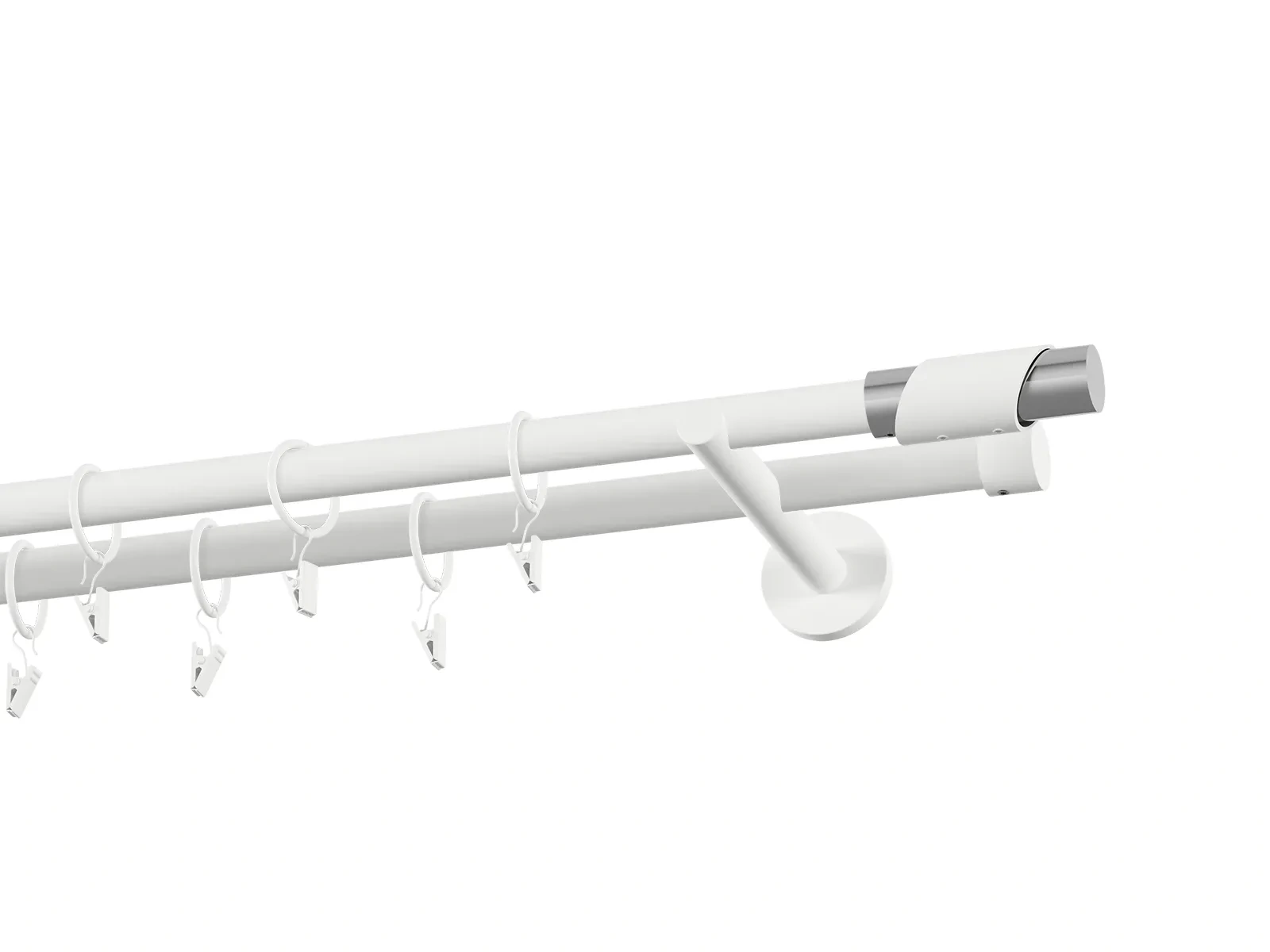Dvojradová garniža s povrchovou úpravou - biela lakovaná. Garniže sú dodávané sú v kompletoch. Tvar koncovky a typ držiaka podľa zadaného výberu.