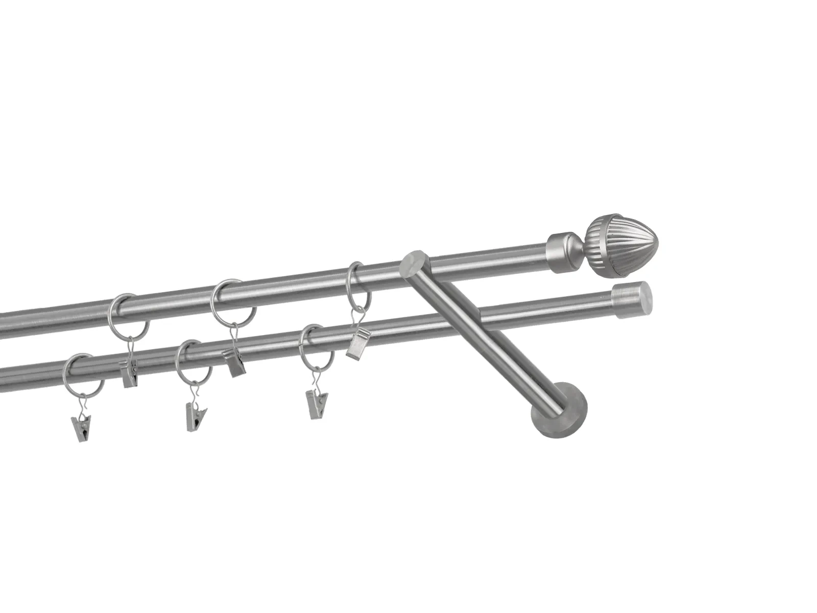Dvojradová garniža s povrchovou úpravou - odtieň satin-nikel (matné striebro). Celokovové garniže s kvalitnou povrchovou úpravou - galvanické pokovovanie. Galvanické pokovovanie zabezpečuje vyššiu povrchovú tvrdosť, zvýšenú dolnosť voči poškriabaniu, hladký povrch. Dodávané sú v kompletoch.
