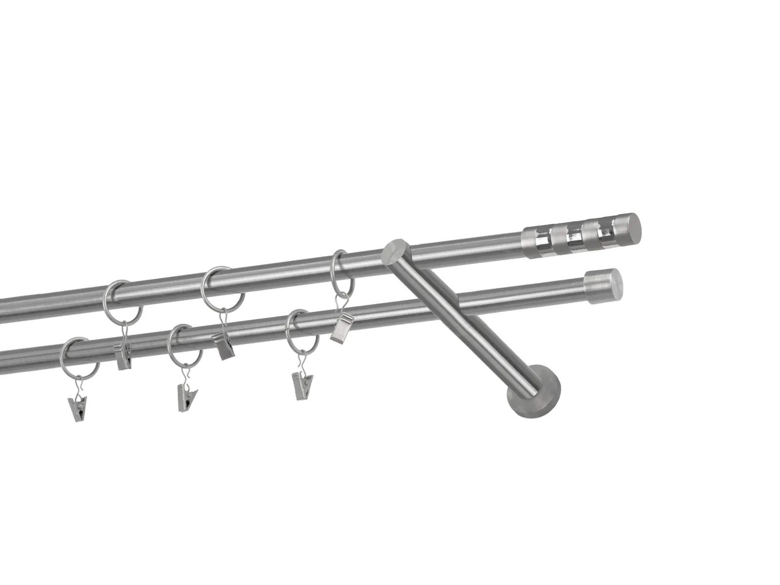 Dvojradová garniža s povrchovou úpravou - odtieň satin-nikel (matné striebro). Celokovové garniže s kvalitnou povrchovou úpravou - galvanické pokovovanie. Galvanické pokovovanie zabezpečuje vyššiu povrchovú tvrdosť, zvýšenú dolnosť voči poškriabaniu, hladký povrch. Dodávané sú v kompletoch.
