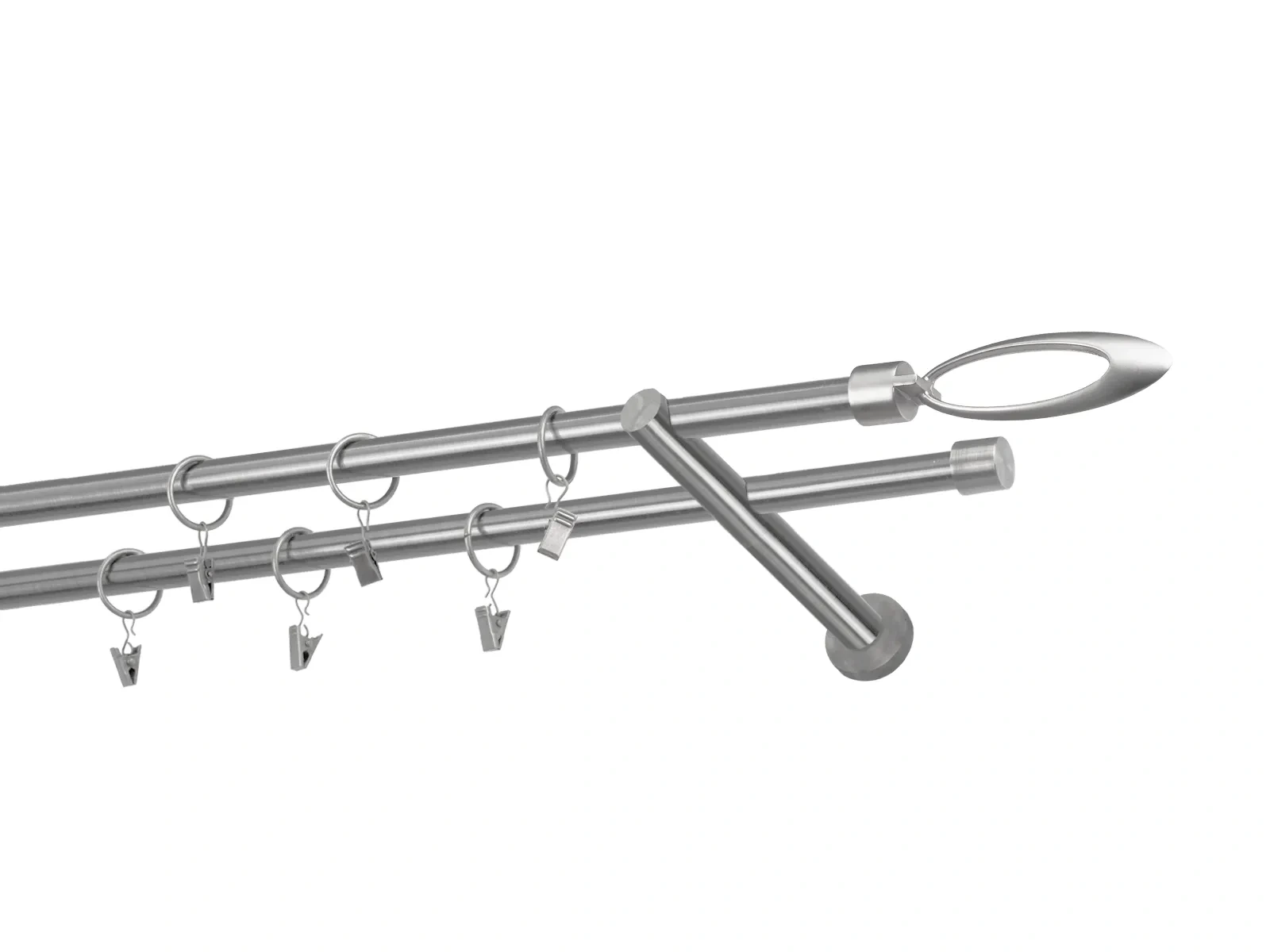 Dĺžka 1600 mm - tyč 16mm - 1600mm - 2ks, držiak dvojitý - 2ks, koncovka - 2ks, koncovka zadná(PULLO) - 2ks, krúžok so štipcom - 30ks (pri výbere parametra príslušenstvo s krúžkami so štipcom), skrutky a hmoždinky na montáž