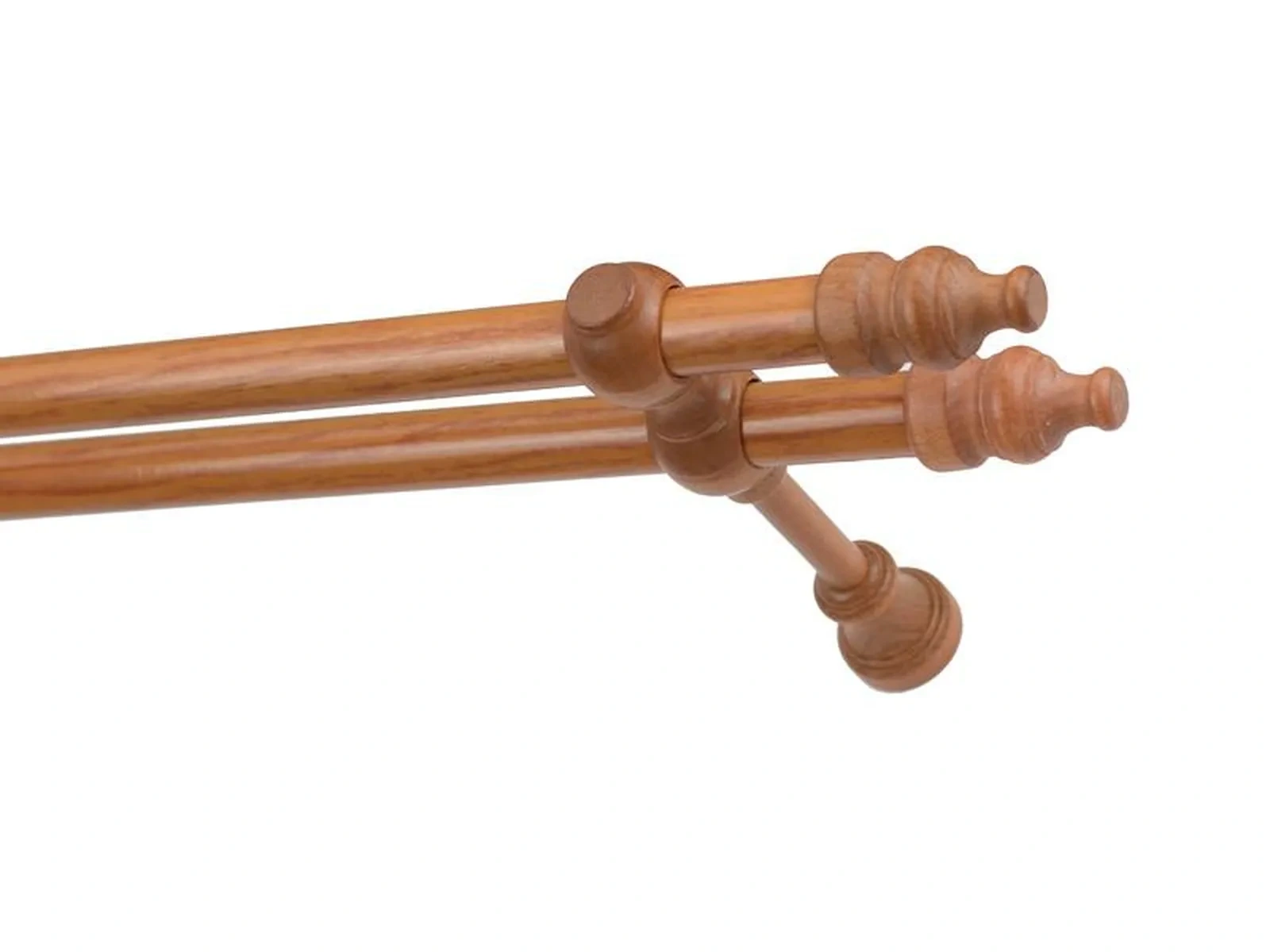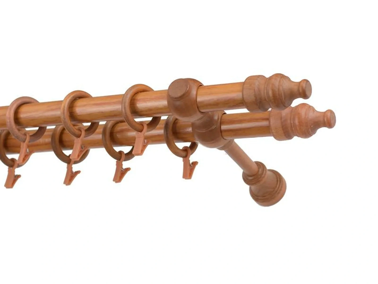 Koncovky a držiaky a krúžky sú drevené. Tyč je drevená (vyrábaná technológiou ako europrofily pre okna - čo eliminuje ohýbanie vplyvom tepla) a je potiahnutá odolnou drevoimitačnou fóliou. Dodávané sú v kompletoch.