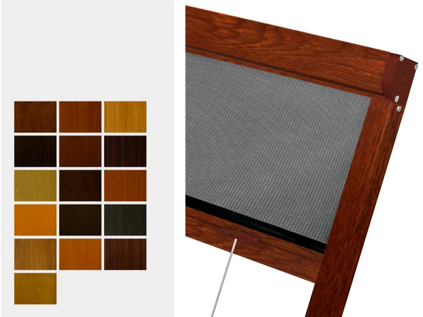 Sieťky proti hmyzu v úprave renolit sú vyrábané z hliníkového profilu, ktoré sú potiahnuté drevoimitačnou fóliou, ktorá sa používa aj pri výrobe plastových okien v drevoimitačnej úprave. Použité názvy sú originálne názvy fólií RENOLIT. Zobrazené farby sú závislé od nastavenia vášho zobrazovacieho zariadenia a môžu líšiť od skutočnosti.